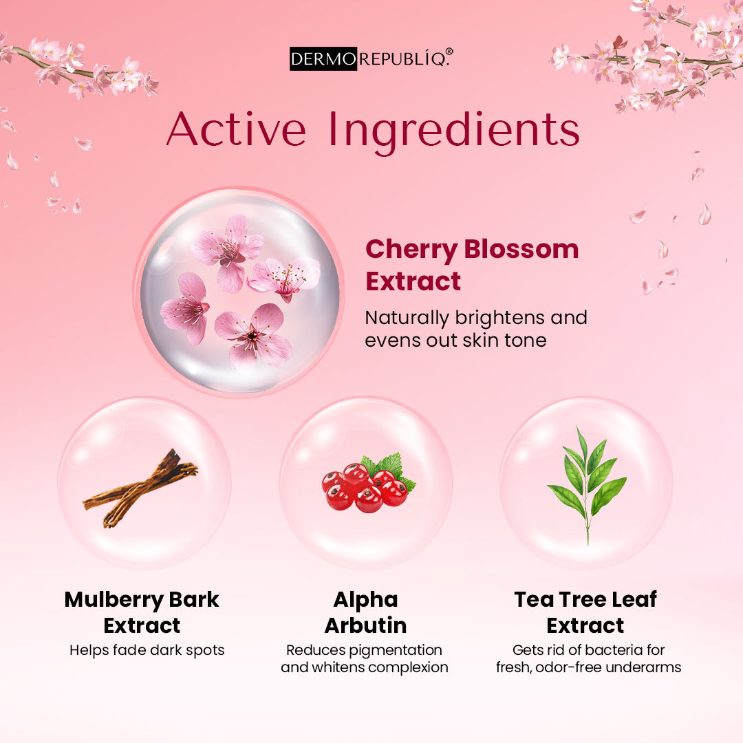This effective formula combines Alpha Arbutin, Mulberry Bark Extract, and Cherry Blossom Extract to target pigmentation and promote a more even tone. Infused with Niacinamide to boost brightness and Allantoin to soothe irritation, ensuring comfort with every application. This cream also provides antibacterial benefits and keeps your underarms fresh and odor-free with Tea Tree Leaf Extract.